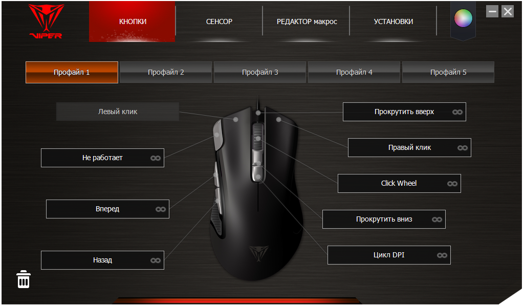 Patriot Viper V551 имеет собственное программное обеспечение, которое потребуется загрузить с официального сайта и установить. При этом драйвер пропишется в автозагрузке и будет оставаться постоянно активным. Первый раздел, который встречает пользователя при старте приложения, называется «Кнопки». Здесь можно переназначить команды для всех кнопок и двух направлений прокрутки, за исключением клавиши «М», которая переключает профили. Все изменения можно сохранить в пять раздельных профайлов, которые содержатся в памяти мыши и мгновенно переключаются соответствующей кнопкой. Каждому из профайлов можно присвоить отдельный цвет подсветки логотипа, чтобы упростить их визуальное определение. Для этого достаточно навести мышь на иконку с названием и выбрать цвет. Жаль только переименовывать их нельзя.