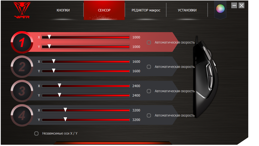 В настройках сенсора каждому из четырех уровней разрешения можно задать значения в диапазоне от 50 до 12 000 cpi. Оси X и Y можно регулировать раздельно. Но самая экзотичная настройка скрыта здесь под наименованием «автоматическая скорость». По сути, это точно регулируемая акселерация. Например, высокое заданное значение скорости будет выставляться при резких движениях мышью. А низкое — при медленном передвижении курсора. Скажу честно, такой вариант настроек сенсора мне встречается впервые. И логичное зерно в нем определенно есть.