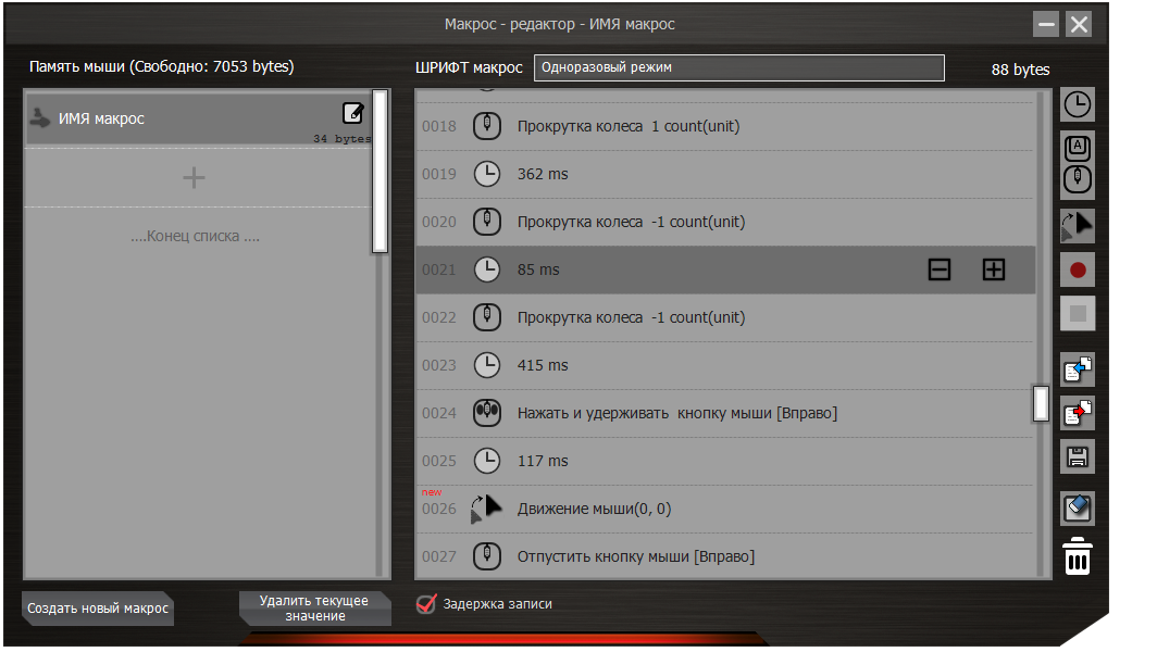 Редактор макросов впечатляет не меньше. Его функциональность выглядит очень продуманной и понятной, при этом нисколько не пытается запутать пользователя обилием лишних функций. Слева есть список созданных макрокоманд. Над ним точно указан объем доступной внутренней памяти. Справа окно записи, где все действия четко пронумерованы и куда можно добавлять команды мыши, клавиатуры, временные задержки и даже траекторию движения курсора. С программированием цепочек команд тут без особых сложностей разберется даже ребёнок.