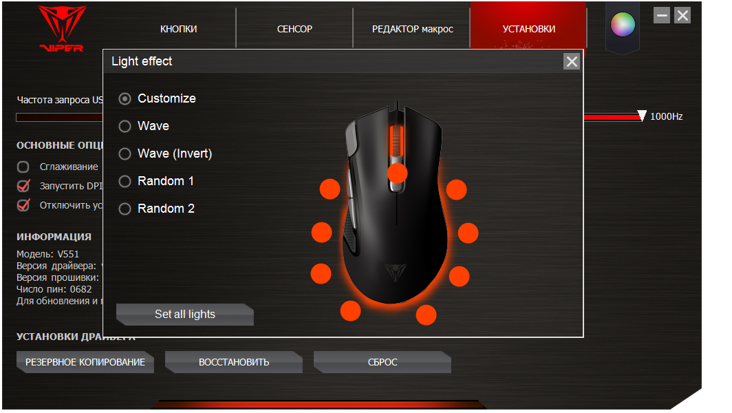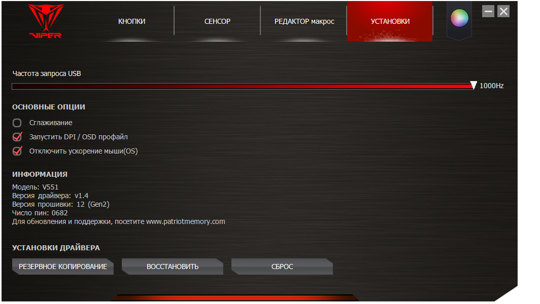 В разделе «Установки» можно включить или отключить сглаживание, активировать OSD-дисплей в левом верхнем углу экрана, где будет обозначаться при переключениях профиль и разрешение, а также отключить системное ускорение курсора мыши. Набор доступных частот опроса сенсора необычен — 125, 142, 166, 200, 250, 333, 500 и 1000 Гц. Внизу есть информация о модели мыши, версии драйвера, версии прошивки и числе пин (что бы оно не значило на самом деле). Клавиши ниже позволяют создать резервную копию драйвера, восстановить её или сбросить все настройки на умолчания.