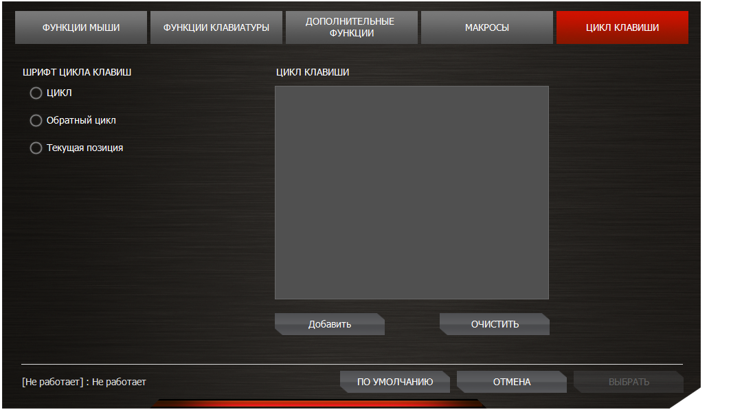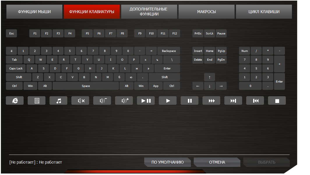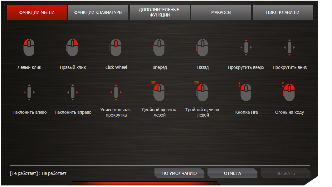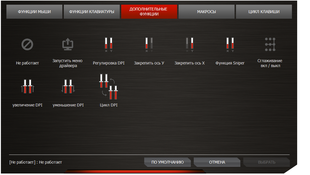 Для всех кнопок можно назначить действия мыши (12 вариантов), команды клавиатуры (любые кнопки включительно с мультимедийными), специальные функции вроде изменений разрешений, включения сглаживания, запуска меню драйвера или функции «Снайпер», макрокоманды или записать последовательные циклы клавиш. Главное отличие от прочих подобных приложений состоит в том, что все доступные функции продемонстрированы наглядно в виде пиктограмм.
