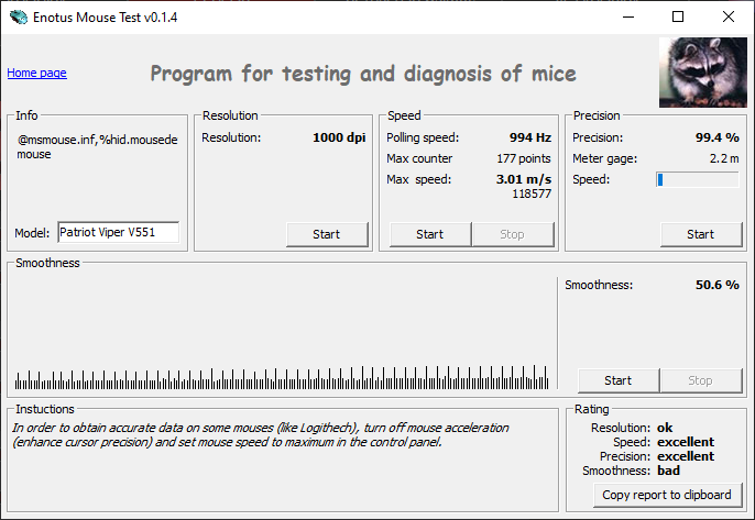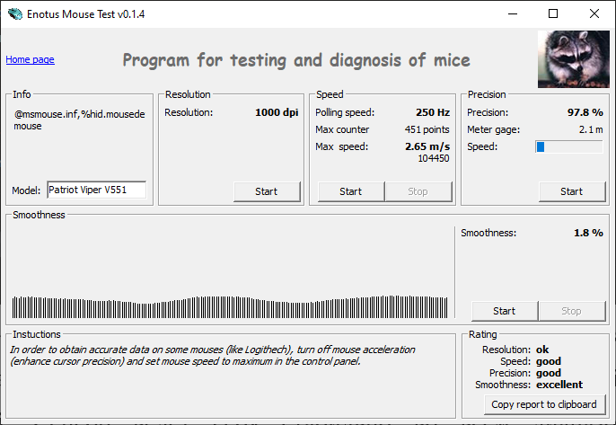 По результатам знакомства с игровой мышью Patriot Viper V551 можно сказать, что она способна удивить. Причем как своими плюсами, так и минусами. Начнем с хорошего. Манипулятор имеет самобытную ассиметричную форму корпуса, идеально комфортную в ладонном хвате и просто удобную во всех остальных типах хвата. Кроме того, корпус сделан очень крепким, что у современных мышей встречается все реже и реже. Еще одним большим плюсом изделия является его бортовая память, позволяющая мгновенно переключать пять вариантов раскладки клавиш. Программное обеспечение сделано, что называется, «для людей». Там есть все, что нужно, и нет лишних и непонятных функций. Есть настройка параметров акселерации с точным указанием целевого разрешения, что не встречалось мне вообще ни в одной мыши за прошедшие 10 лет.