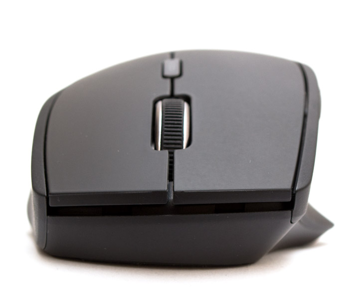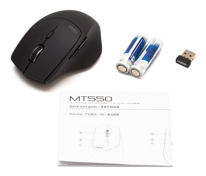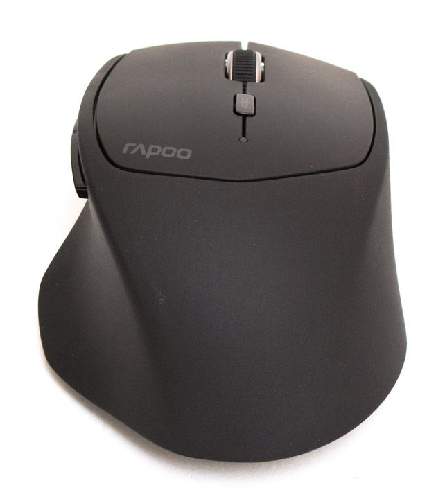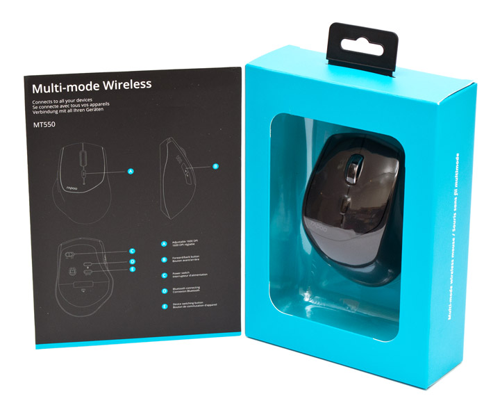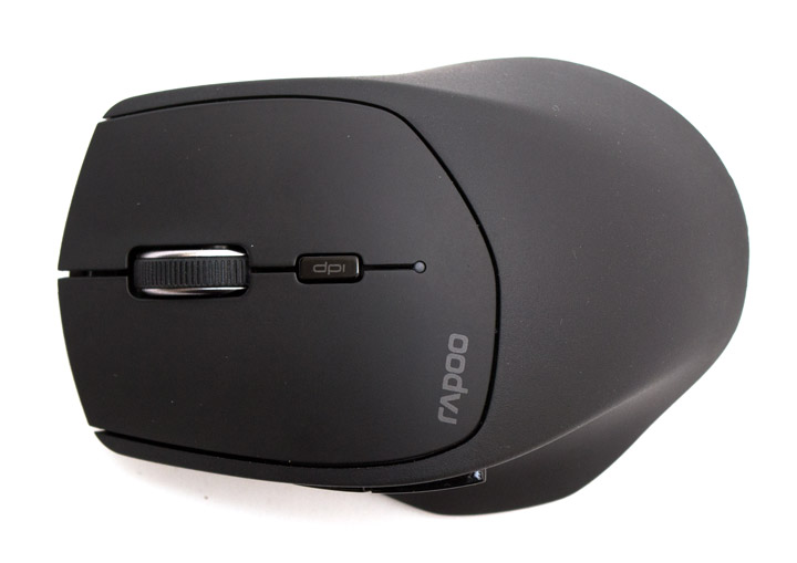 Устройство полностью окрашено в черный цвет. Верхняя панель Rapoo MT550 состоит из двух видов пластмассы. Отдельные панели основных клавиш гладкие, со средней силой сцепления, грязь скапливается на них довольно быстро. Остальной корпус выполнен из слегка шероховатого материала, напоминающего на ощупь резину, цепко сидящего в руке и устойчивого к загрязнению. Основные кнопки нажимаются со средним усилием и слегка приглушенным щелчком. Циклический переключатель разрешения сильно утоплен в корпус, нажимается легко и тихо. За ним, в конце зазора между клавишами, спрятан точечный зеленый/синий индикатор разрешения и Bluetooth. При смене разрешения он моргает от одного до четырех раз.
