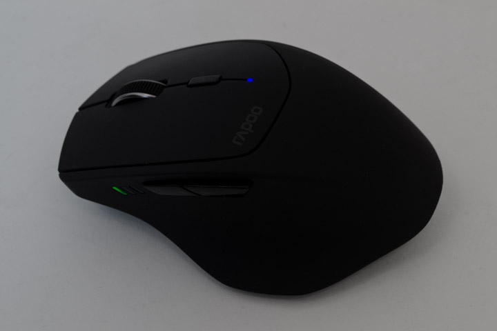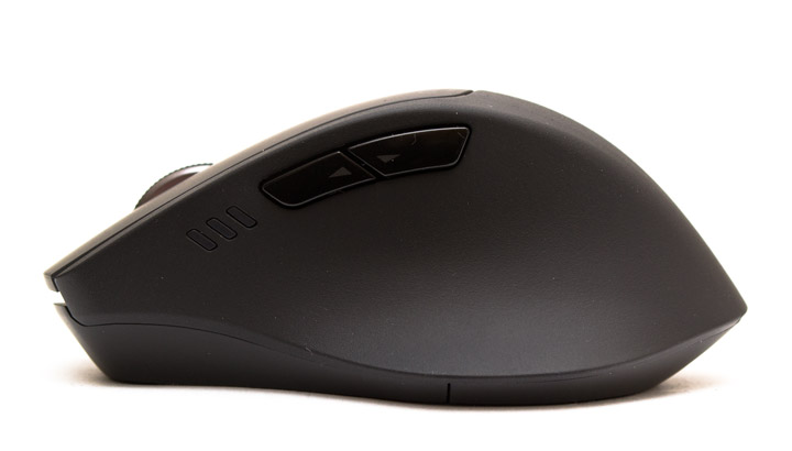 Левая сторона манипулятора выполнена из подобного резине материала и имеет выступ снизу, служащий подставкой под большой палец. Две боковые клавиши глянцевые, с коротким ходом, мягкие и тихие в нажатии. Перед ними, впереди, есть три окошка индикатора текущего подключенного устройства. Они моргают зеленым цветом по очереди при смене текущего устройства, или соединении с ним.