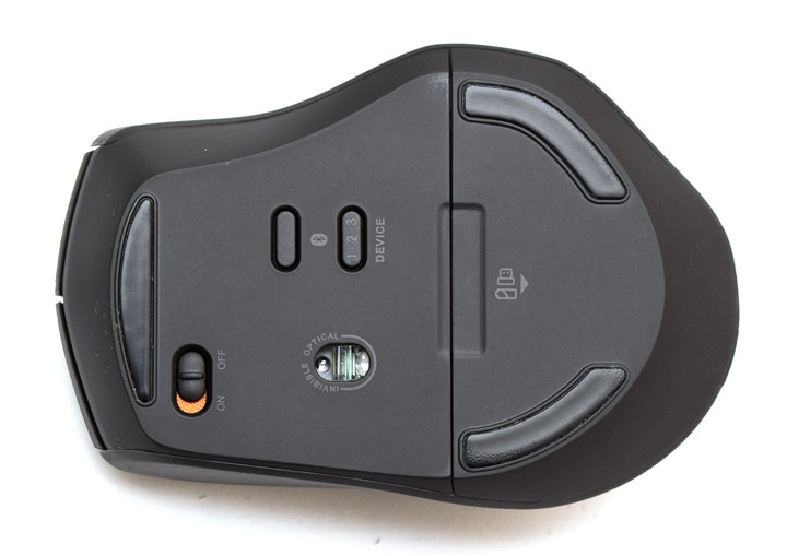 Основание мыши весьма насыщенно. Две тонкие тефлоновые ножки наклеены на крышку батарейного отсека, а еще одна — впереди. По умолчанию на них наклеены защитные пленки, потому, если мышь не скользит, значит, их забыли снять. Оптический сенсор с невидимой инфракрасной подсветкой смещен вперед и вправо. Над ним есть выключатель питания, а слева — две овальные клавиши. Передняя отвечает за соединение с Bluetooth-устройствами, а та, что за ней — за переключение присоединенных устройств.