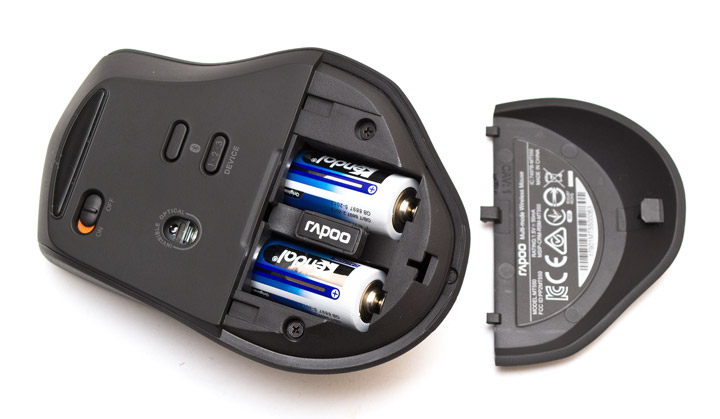 Форма Rapoo MT550 подходит исключительно под использование правой рукой, в пальцевом или когтевом хвате. Держать ее полной ладонью неудобно из-за небольших габаритов. Кроме того, баланс веса и общая эргономика устройства сильно зависит от количества и места установки в нем батарей. Мышь стабильно работает и от одной АА-батарейки, имея при этом вес в 96 г. Если поставить вторую, то вес возрастает до 119 грамм и при отрывах манипулятор сильно заваливается в сторону кормы. Поэтому оптимально, с моей точки зрения, эксплуатировать ее с одним элементом питания, установленным со стороны левой панели мыши.