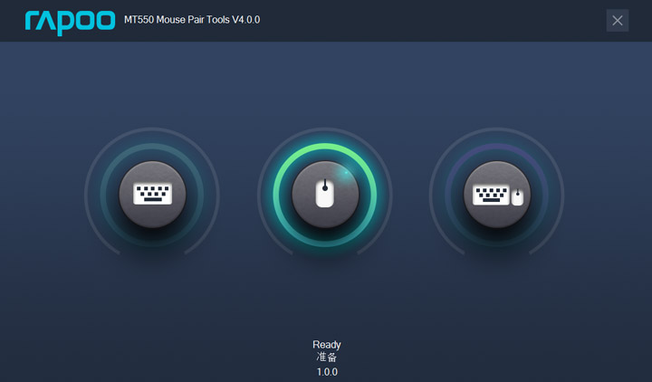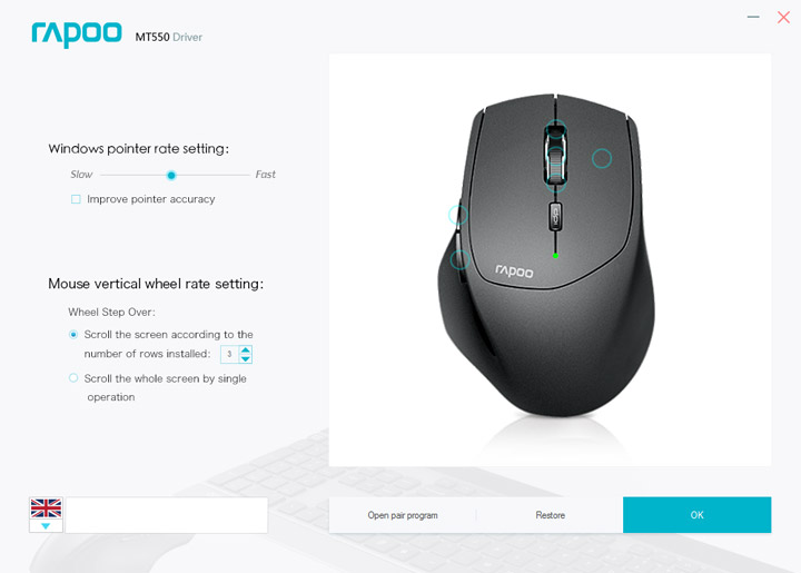 Rapoo MT550 использует собственный специальный драйвер (его можно загрузить с официальной страницы продукта), которому требуется установка, после чего он прописывается в автозагрузке без возможности отключения. Драйвер работает только при подключении мыши через родной приемник, по Bluetooth устройство не определяется и работает на «заводских» настройках. Прямо со стартовой страницы пользователь может выбрать скорость движения курсора Windows, включить режим повышенной точности, назначить количество строк для шагов колеса прокрутки, переназначить четыре кнопки и два направления прокрутки на другие команды, выбрать язык интерфейса или открыть программу для возобновления связи с приемником. Языков интерфейса на выбор доступно 12 штук (включая русский и украинский), но локализованы команды лишь частично.