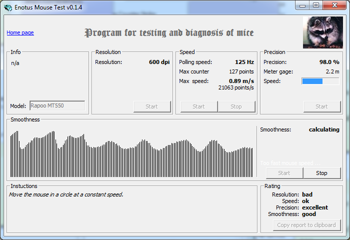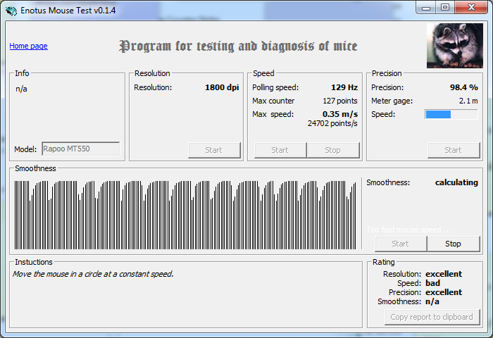 Установленный в мыши оптический сенсор с инфракрасной подсветкой порадовать пользователя ничем особо не сможет. Он очень бюджетный по всем своим параметрам. Доступный диапазон разрешений в 600/1000/1300/1600 dpi на самом деле смещен приблизительно на одну сотню dpi вверх на каждом уровне. Максимальная скорость в 1 м/с достигается лишь на самом низком разрешении, в то время как на 1600 dpi срывы курсора наступают уже после 0,4 м/с. Частота опроса — 125 Гц, высота отрыва колеблется в районе 4 мм, сглаживание огромное, есть акселерация. А идеальные прямые линии мышь рисует и без включения соответствующего пункта в настройках. Кроме того, сенсор плохо работает на глянцевых поверхностях. Одним словом, точность позиционирования курсора низкая, и хотя для офисной деятельности Rapoo MT550 вполне хватает, в интенсивные игры на ней лучше даже не пытаться играть.
