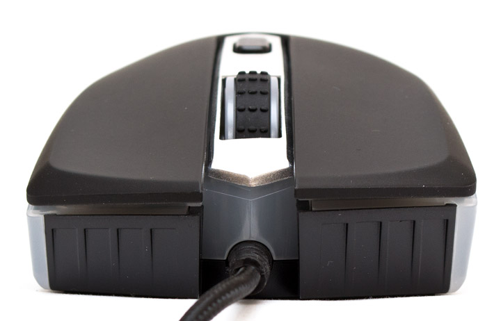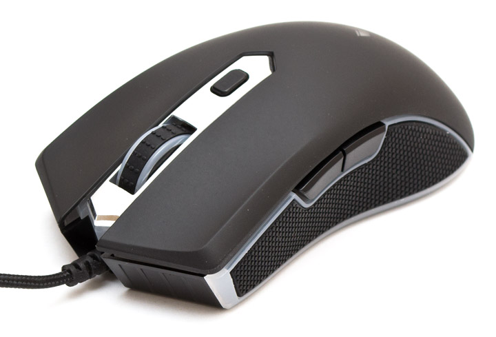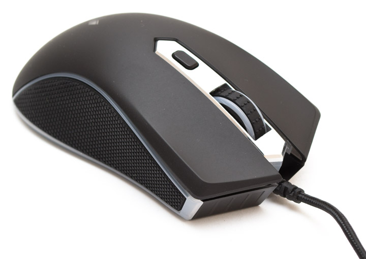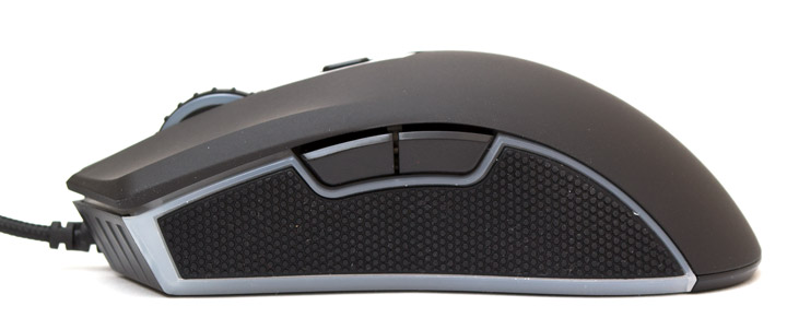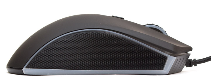Левая боковина мыши выполнена из полупрозрачного пластика, на большую часть которого наклеена цепкая резиновая поверхность с текстурой в виде мелких пупырышек. Прозрачный контур подсвечивается, причем раздельно в передней, средней и задней зонах. Ровно по центру расположены две дополнительные клавиши среднего размера, они нажимаются плавно и мягко, ход ровный, без существенной отдачи. Звук срабатывания переключателей негромкий.