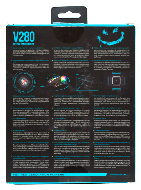 Основной профиль компании Rapoo — это, конечно же, беспроводная периферия для ПК и мобильных устройств. Однако на сегодня, ограничивать себя столь узким сегментом рынка нецелесообразно для любого производителя. Вот и Rapoo, очевидно, решили поэкспериментировать с игровыми девайсами и создали линейку VPro, чтобы как-то визуально разделить два направления своего бизнеса для публики. В каком именно виде VPro будут позиционироваться в конечном итоге, вероятно, не знает сама компания. А пока что у нас есть шанс познакомиться с одним из наиболее пестрых продуктов в линейке — мышью V280, обладающей цветной подсветкой и претендующей на звание "игровой". Посмотрим, оправданы ли на самом деле эти претензии.
