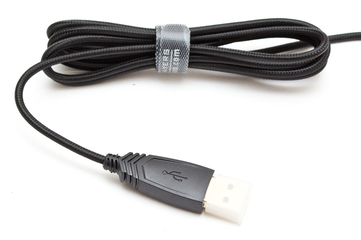 Сигнальный USB-кабель в нейлоновой оплетке имеет длину в 1,8 метра. Он довольно толстый, твердый и жесткий, склонен постоянно поддерживать заданную форму. На кабеле есть многоразовая липучка Velcro, с помощью которой его длину можно удобно регулировать. Позолоченный разъем имеет съемный колпачок, защищающий его от попадания пыли при транспортировке мыши.