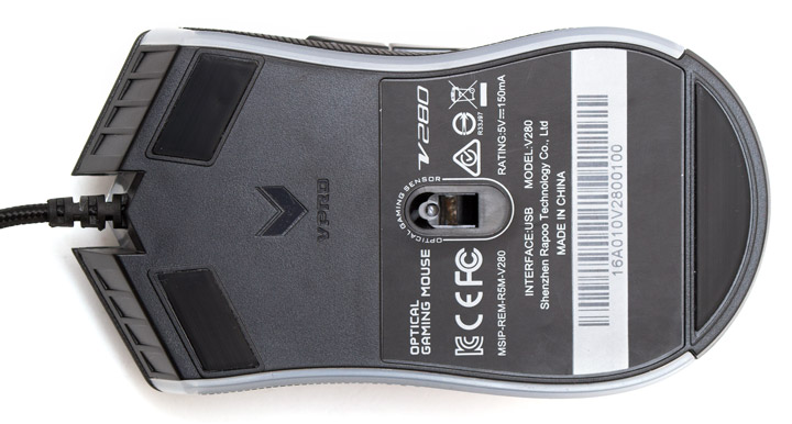 На днище мыши присутствуют три тефлоновые ножки — две в передней и одна в задней части. Изначально на них есть малозаметные прозрачные транспортные пленки, и, если забыть их снять, мышь скользить практически не будет. Сенсор с яркой видимой подсветкой красного цвета расположен ровно по центру. Датчик удалось идентифицировать как Pixart PMW3320DB-TYDU, с номинальным разрешением в 3500 dpi, умноженном в данном случае вдвое, с помощью встроенного ARM чипа. На случай, если кому-то захочется разобрать корпус манипулятора, отметим, что по одному винту находится под передними ножками и еще два — по углам, под задней частью наклейки с серийным номером.