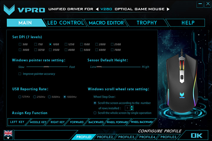 Самой большой проблемой в использовании драйвера Rapoo V280 были попытки разыскать его в дебрях официальных сайтов. Когда же это удалось, ПО было установлено, и мы приступили к его изучению. Мышь обладает встроенной памятью, потому драйвер требуется лишь для изначальной настройки либо корректировки устройства и не занимает место в оперативной памяти все остальное время. Сразу с момента запуска главного экрана нам доступен огромный выбор фиксированных значений разрешения в пределах от 500 до 7000 dpi. Одновременно можно включить в ротацию не более семи из них, хотя, как правило, достаточно и двух. Переключение разрешений производится отдельной кнопкой и сопровождается световым эффектом со стороны подсветки, причем цвет будет соответствовать его порядку в "радуге". Тут же доступно управление Windows акселерацией курсора и регулировка высоты отрыва сенсора. Последняя кардинально ничего не изменяет в поведении мыши, потому ее смело можно выставлять в минимум. Кроме того, можно выбрать частоту опроса сенсора в рамках привычных 125 / 250 / 500 или 1000 Гц и настроить алгоритм работы колеса прокрутки.