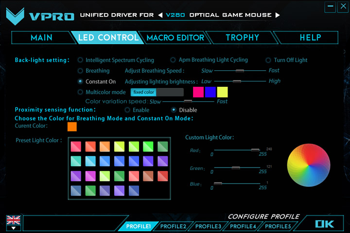 Возможности настройки подсветки самые разнообразные. Можно полностью выключить подсветку, заставить ее светится одним или тремя вариантами цветов. Можно включить режим дыхания или последовательной смены цветов, настроить скорость и яркость изменений соответственно. Есть вариант реакции подсветкой на нажатия, но самое интересное — подсветка при приближении ладони. Не совсем понятно, как именно это реализовано в данном случае, но мышь включает подсветку только, когда пользователь подносит к ней руку, касаться при этом манипулятора даже не обязательно. Цветная палитра доступна пользователю, как в виде предустановленных расцветок, так и с возможностью задать конкретный электронный цвет.