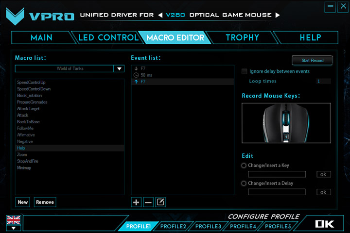 Редактор макросов вполне стандартен, хотя по умолчанию в нем уже есть целые наборы команд, для отдельных наиболее популярных игр. Редактор воспринимает только клавиатурные команды с заданной задержкой или без нее.