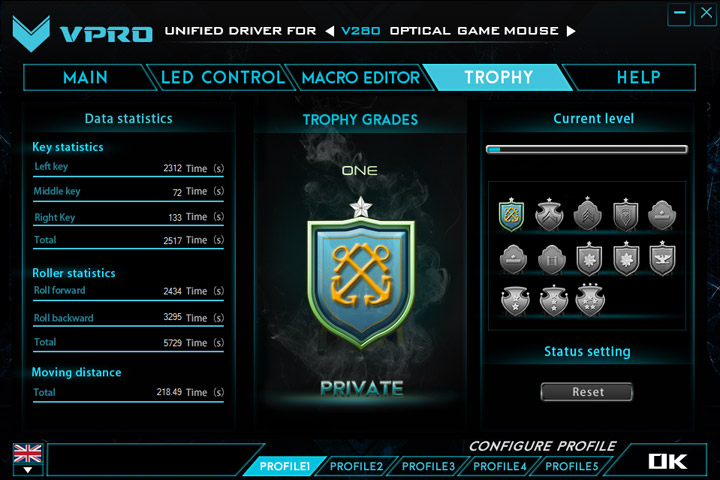 Экран "трофеев", по сути, является формой статистики, по которой можно отследить такие параметры использования мыши, как количество кликов, пройденное расстояние или дистанцию прокрутки колеса. При желании показатели можно сбросить и начать все заново.