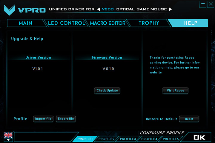 В разделе помощи можно узнать текущую версию драйвера, попытаться обновить прошивку мыши или отправиться прямиком на официальный сайт. Кроме того есть возможность импорта или экспорта профилей в память ПК либо сброс всех настроек по умолчанию.