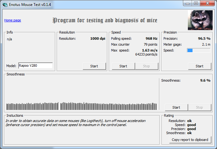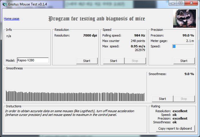 О том, что пытались выжать в Rapoo из установленного здесь бюджетного сенсора Pixart PMW3320 наверное можно написать отдельную сагу. Прежде всего, технический потолок разрешения этого датчика составляет 3500 dpi. И стабильностью работы при таких значениях он вовсе не отличается. Тут же, максимум удвоили до 7000 dpi с помощью встроенного чипа. К сожалению, помимо красивых больших цифр это не принесло для V280 никакой практической пользы. Даже изначально невысокие паспортные параметры допустимой скорости и ускорения (20G при 1,52 м/с) на таких значениях проседают вдвое. Чтобы вызвать срыв курсора у данного манипулятора вовсе не нужно быть резким кибер-атлетом, достаточно лишь дернуть его чуть быстрее обычного. А при 7000 dpi его и дергать то особо не приходится. Второй момент — это высота отрыва. Она очень высокая и местами может достигать 3 мм в пике, что непременно сказывается на точности курсора при отрывах и перестановках мыши. Настройки данного параметра в драйвере ни на что особо не влияют. Разве что сглаживание и акселерация тут ощущаются как относительно нормальные. Касательно диапазона разрешений, если пользователь желает применять данную мышь в игровых условиях, я бы не рекомендовал выставлять его ниже 1000 dpi, либо превышать 2500 dpi, чтобы не столкнуться с артефактами в поведении курсора.