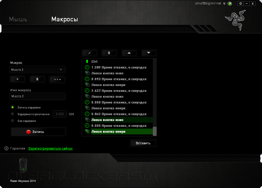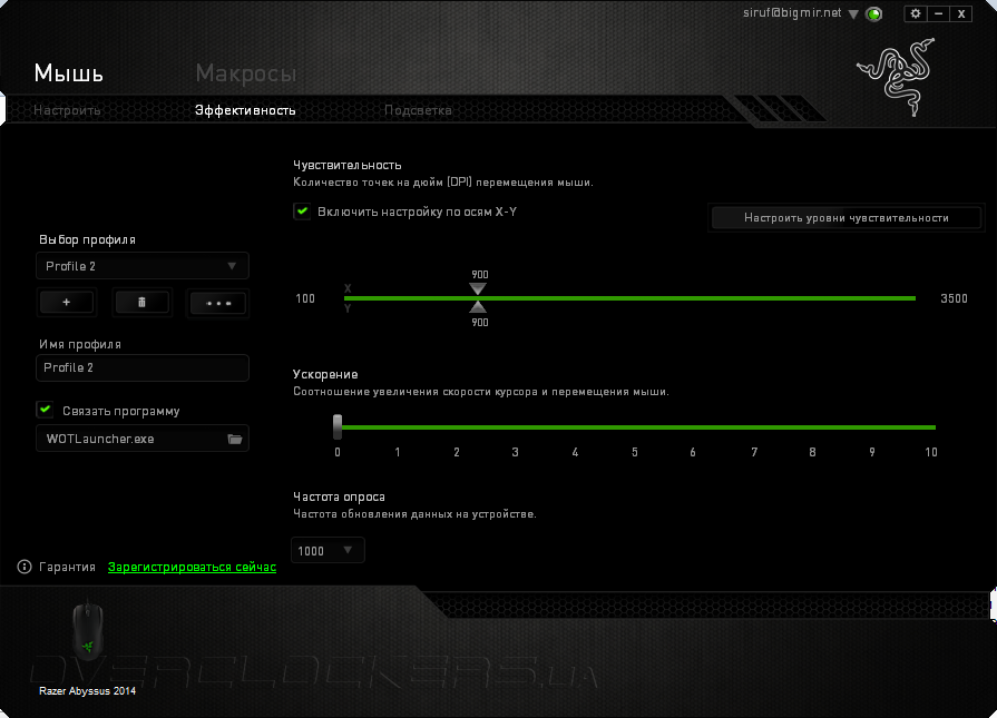 Ранее Abyssus использовал собственный уникальный драйвер. Новая версия манипулятора уже поддерживает универсальное фирменное программное обеспечение Razer Synapse 2.0, полагающееся на связь с серверами производителя и облачное хранение настроек мыши. Единственным существенным недостатком такого решения является необходимость регистрации своей учетной записи и привязка ее к электронной почте. То есть — поставить и использовать ее на компьютерах, не имеющих доступа в сеть интернет, будет крайне проблематично, хотя и предусмотрен режим автономной работы. Зато преимуществ больше: используется одна программа для настройки всех устройств, все настройки доступны на любой машине из облака, своевременно получаются все важные обновления и прошивки, можно всегда отследить состояние гарантии на свой продукт, если его предварительно зарегистрировать. Итак, первый экран, который обычно встречает пользователя в Synapse — это настройка кнопок манипулятора. Кроме левой, средней и правой клавиш, можно устанавливать команды на прокрутку вверх и вниз. Итого пять команд. Для них можно сохранять неограниченное количество профилей, которые будут автоматически переключаться при старте связанного с ними приложения.