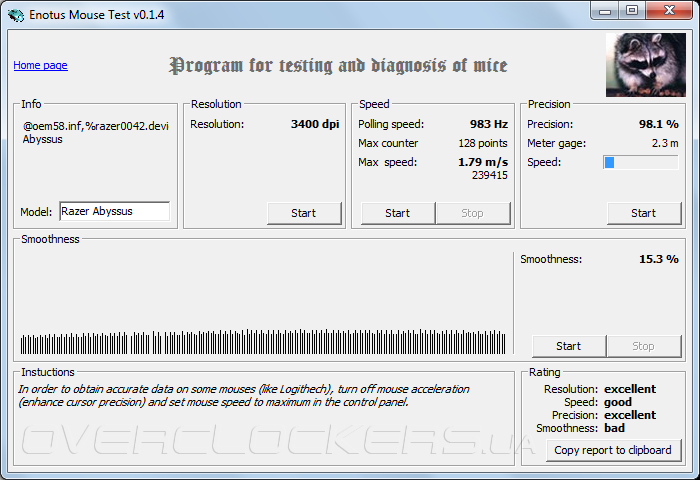Использование Razer Abyssus в качестве мыши для повседневной работы и игр позволило мне сложить о ней исключительно позитивное впечатление. Прежде всего, обновленный дизайн и форма манипулятора оказались очень удобными и приятными в эксплуатации. Abyssus отлично лежит в руке любого размера и подходит для использования с любым типом хвата. Цепкие боковины, хорошая балансировка корпуса и предельно малый вес (всего 80 г) позволяют производить интенсивные движения и перестановки. Сенсор Avago ADNS-3888 проявил себя хорошо. Высокая точность позиционирования курсора и отсутствие проблем позволяют использовать его даже в кибер-спортивных соревнованиях. Однако есть несколько оговорок. Прежде всего, манипулятору понадобится хороший коврик (во время теста я использовал средний по качеству XTracGear Logic Hex Pad), поскольку сенсор оказался придирчив к типу поверхностей, и на обычном столе работать он не будет. Во-вторых, высота отрыва колеблется в пределах от 2 до 3 мм, что может привести к подергиванию курсора при перестановках. И наконец — сам Razer отмечает на официальном сайте, что в некоторых экземплярах может быть проблема со срывом курсора при использовании на максимальном разрешении, что, к счастью, легко исправляется обновлением прошивки устройства.