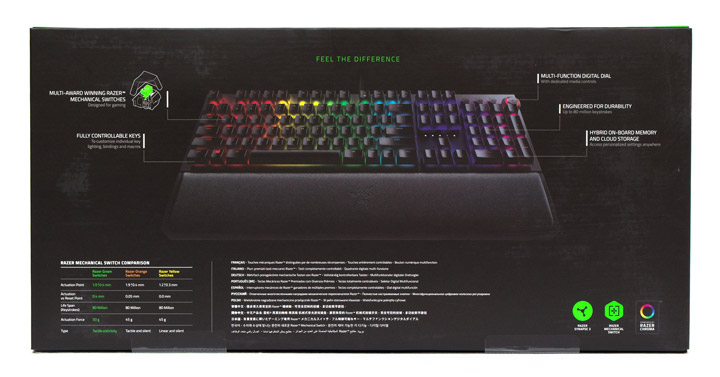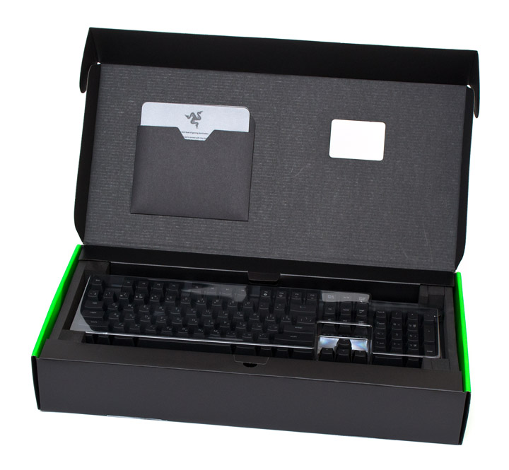 В оформлении упаковки мало что изменилось внешне, все продукты Razer, по-прежнему, несут на своих коробках цветную полиграфию в черно-зеленых тонах. Спереди есть изображение клавиатуры, указано ее название и тип используемых переключателей, которые можно пощелкать через специальное окно. К сожалению, из комплекта пропал сувенирный брелок в виде переключателя с батарейкой. На обратной стороне есть описание главных достоинств устройства и приведены данные от трех типах переключателей, с которыми выпускается эта клавиатура — зеленых, оранжевых и желтых. Про габариты, язык раскладки и системные требования клавиатуры можно почитать на боковине.