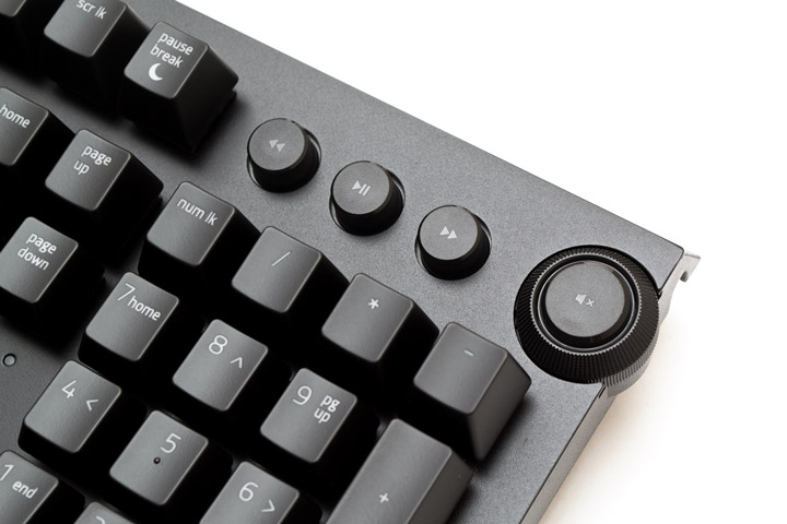 Цифровой и стрелочный блок оформлены стандартно. Однако весь набор из пяти индикаторов смещен в положение над стрелочным блоком, поскольку правый верхний угол клавиатуры занят тремя кнопками мультимедиа и колесом регулировки громкости. Индикаторы подписаны как «С» (Caps Lock), «1» (Num Lock), «S» (Scroll Lock), «M» (Макро), «G» (игровой режим), однако подписи слабо различимы даже при хорошем освещении, и то, только под определенным углом. Все индикаторы подсвечиваются белым цветом, кроме «М» который горит красным.