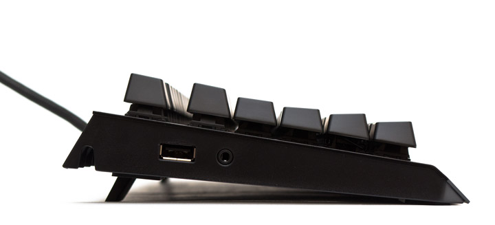 Внешние сквозные порты в составе одного USB 2.0 и одного спаренного 3,5-мм аудио-разъема переехали с правой боковины на левую, и это очень хорошо. Теперь подключенная «флешка» или наушники не мешают движению мыши по ковру, включать устройства с этой стороны намного удобнее, поскольку их видно визуально. А благодаря системе укладки проводов, сигнальный кабель теперь можно вывести не только сзади, но и с обеих сторон, что тоже будет весьма полезно в определенных ситуациях. Боковые панели пластиковые. Угол наклона рядов клавиш небольшой, от изменения угла наклона клавиатуры особой разницы в эргономике не ощущается.
