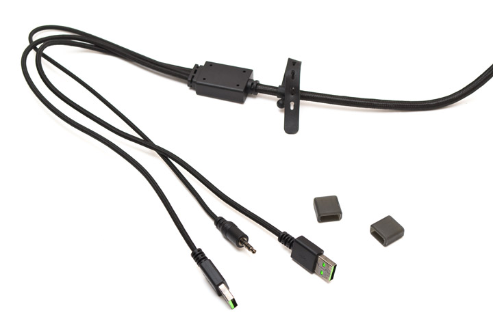 Сигнальный кабель имеет длину в 1,9 метра, полностью покрыт оплеткой и состоит из толстой и негибкой части, которая после коробки разветвителя преобразуется в три отдельных более тонких провода, один из которых служит для подключения самой клавиатуры, а два других — для присоединения к ПК сквозных портов. Для USB-разъемов в комплекте есть защитные колпачки, а на самом кабеле закреплена резиновая многоразовая стяжка, позволяющая смотать его лишнюю длину. Контактные площадки разъемов покрашены в зеленый цвет.