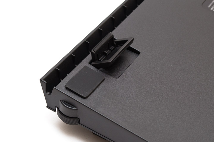 Раскладные ножки можно развернуть в два уровня, на обеих есть резиновые нашлепки, благодаря которым клавиатура имеет очень хорошее сцепление с поверхностью стола. В базовом положении высота клавиатуры по ряду задних клавиш составляет 43 мм, с мелкими ножками 48 мм, а с крупными 55 мм.