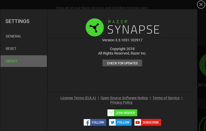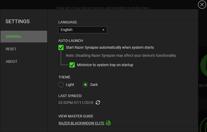 Razer BlackWidow Elite поддерживается обновленным универсальным программным обеспечением Razer Synapse версии 3.3.1031.102917. В случае использования Windows 10, операционная система предложит загрузить этот драйвер автоматически. Параллельно будет установлен программный хаб Razer Central, который контролирует учетные записи пользователей данного ПО. Для программы можно выбрать один из 10 языков включительно с русским, настроить параметры автозапуска, выбрать светлую или темную тему интерфейса, синхронизировать с настройками в облаке или почитать руководство по клавиатуре. Кроме того, можно сбросить руководство по продукту и по ПО, чтобы ознакомиться с ним заново и принудительно обновить драйвер. Негативным моментом по-прежнему является необходимость проходить онлайн регистрацию, чтобы иметь возможность запустить это приложение, хотя после первого входа оно и может работать в автономном режиме.