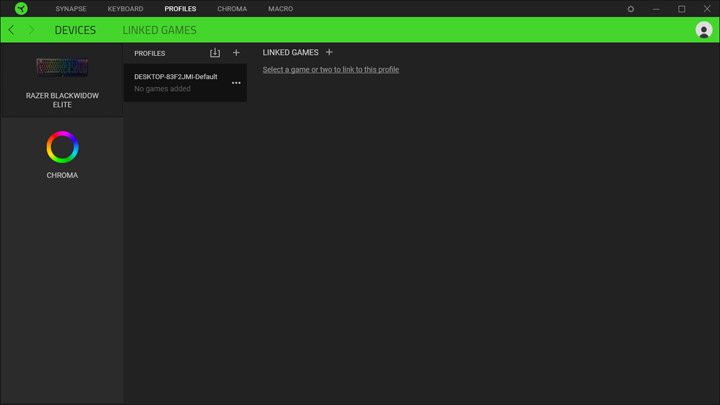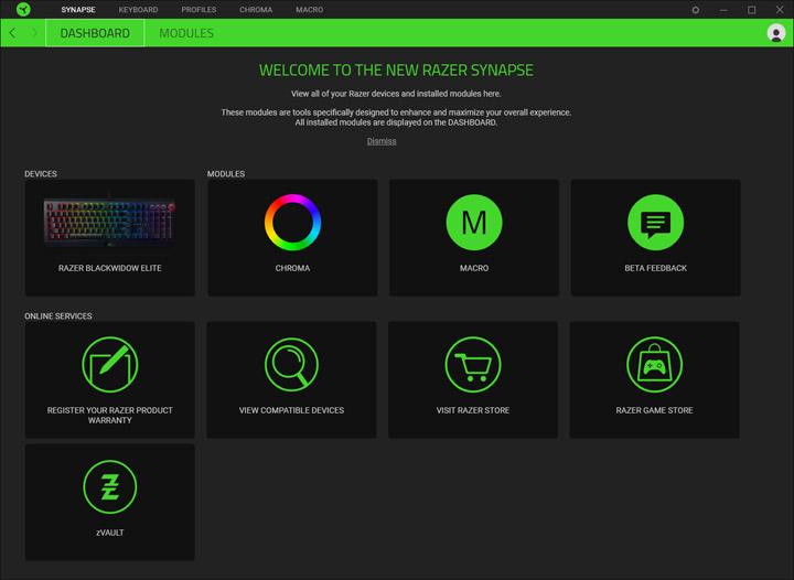На стартовом экране программы пользователь получает доступ к подключенным устройствам, установленным модулям и к онлайн-сервисам. В частности, к модулям теперь относится студия эффектов Chroma и редактор макросов, дополнительно можно поставить модуль для управления эффектами подсветки устройств, поддерживающих Philips HUE. Еще с главного экрана можно отправить отзыв от текущей версии ПО, зарегистрировать свой продукт, посмотреть список совместимых устройств, посетить магазин продукции Razer или игровой магазин и заглянуть в электронный кошелек zVault.