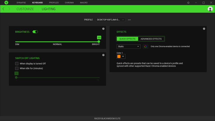 В настройках подсветки можно включить или отключить ее полностью, отрегулировать яркость в пределах от 33 до 100%, выставить отключение вместе с дисплеем и установить задержку отключения в пределах от одной до 15 минут. В окне выборе эффектов можно воспользоваться быстрыми настройками, в частности выбрать один из восьми визуальных эффектов, отрегулировать их скорость, направление, продолжительность, цвет и порядок воспроизведения. Либо можно включить улучшенные эффекты и попасть в Chroma-студию для индивидуальной настройки всех параметров. Кроме того, можно продублировать настройки подсветки на другие устройства Razer, которые их поддерживают.