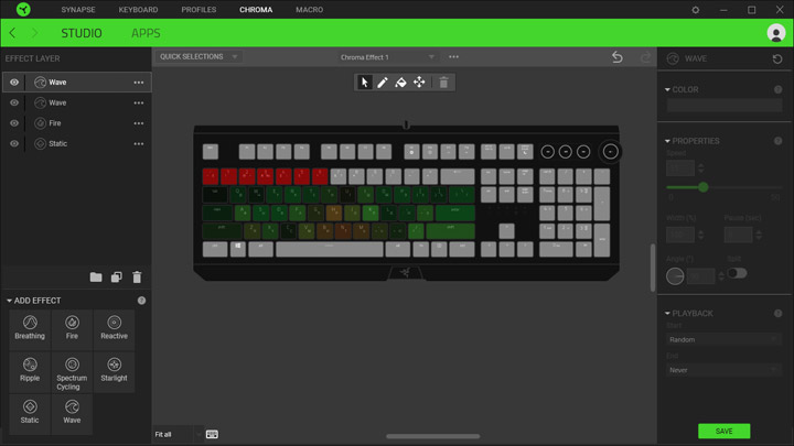В разделе Chroma все клавиши можно настраивать как угодно, с любыми эффектами, и даже слоями эффектов.
