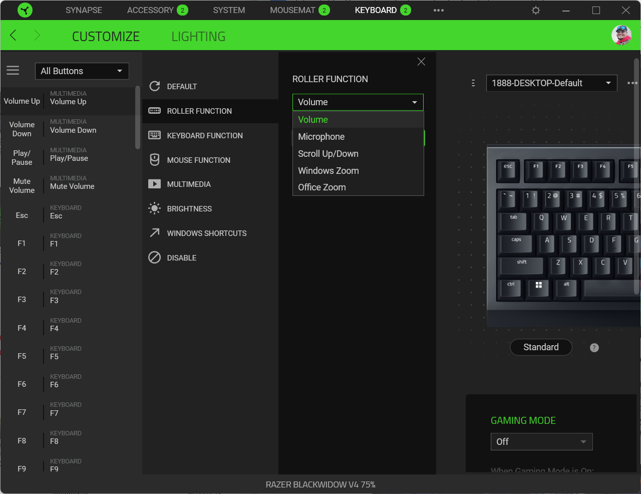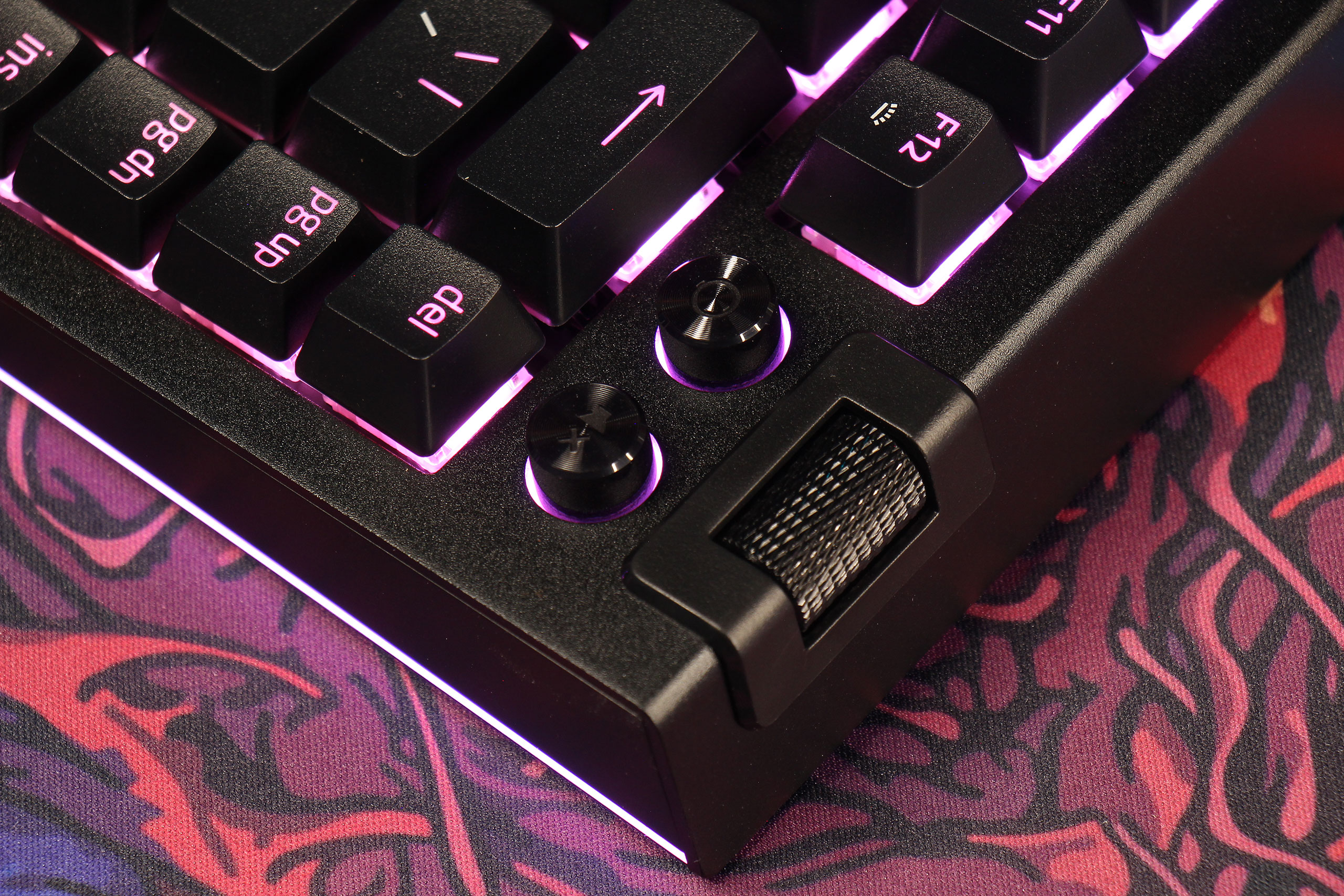 Для четвертого поколения Blackwidow разработали единый стиль дополнительных элементов в правом верхнем углу — колесика (по умолчанию это регулировка громкости) и круглых мультимедийных клавиш. Именно на модели V4 75% таких клавиш две, на полноформатных их четыре. Эти детали изготовлены из металла и очень приятно-«премиальны» на ощупь.