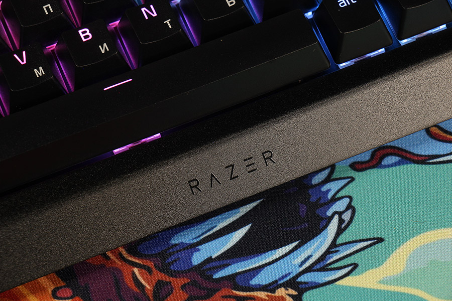 По центру нанесено название производителя фирменным шрифтом. Оно не светится, в отличие от эмблемы на третьем поколении Blackwidow, и на многих других клавиатурах Razer.
