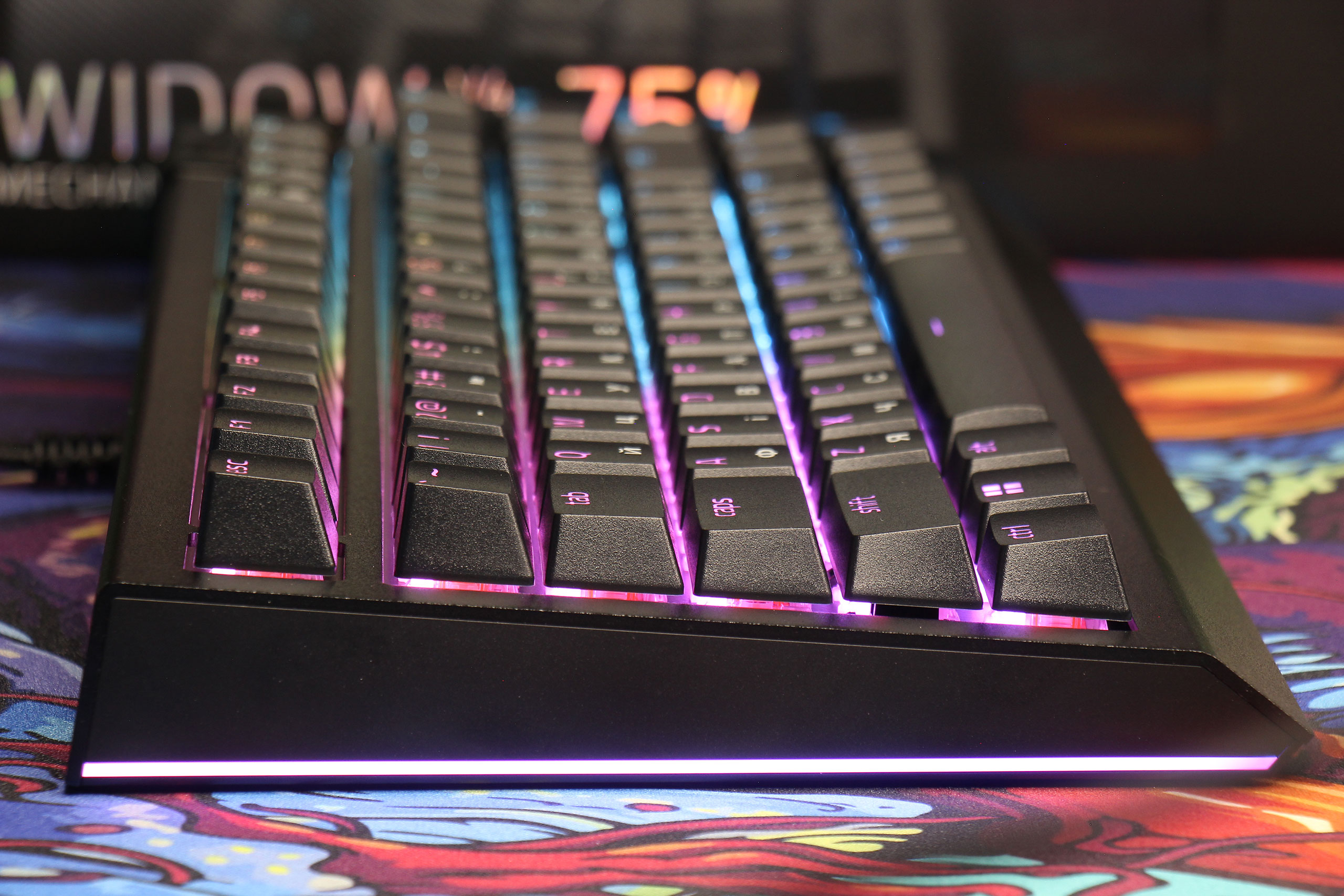 Razer Blackwidow традиционно имеет достаточно сдержанную внешность, при этом, конечно, отвечая стандартам дизайна Razer. Самая заметная особенность этой модели — ее формат, известный как 75%. Razer используют его впервые, так как обычно линейки ее клавиатур состоят из полноразмерных, TKL и компактных 60-65% (без ряда F-клавиш). И вот именно отсутствие функциональных клавиш отталкивает многих покупателей, поэтому компромиссные 75% клавиатуры стали популярными среди энтузиастов.