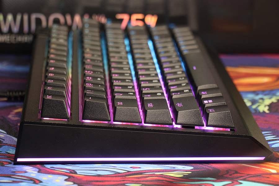 Razer комплектует Blackwidow V4 75% кейкапами самого распространённого профиля типа OEM. Они двойного литья, но, к сожалению, сделаны из ABS-пластика, поэтому в долгосрочной перспективе менее выносливы, чем изготавливаемые из PBT. Еще более обидно, что для украинского рынка на них нанесена простая гравировка букв и они не просвечиваются. Впрочем, для тех, кому это актуально, без подсветки обе маркировки читаются хорошо.