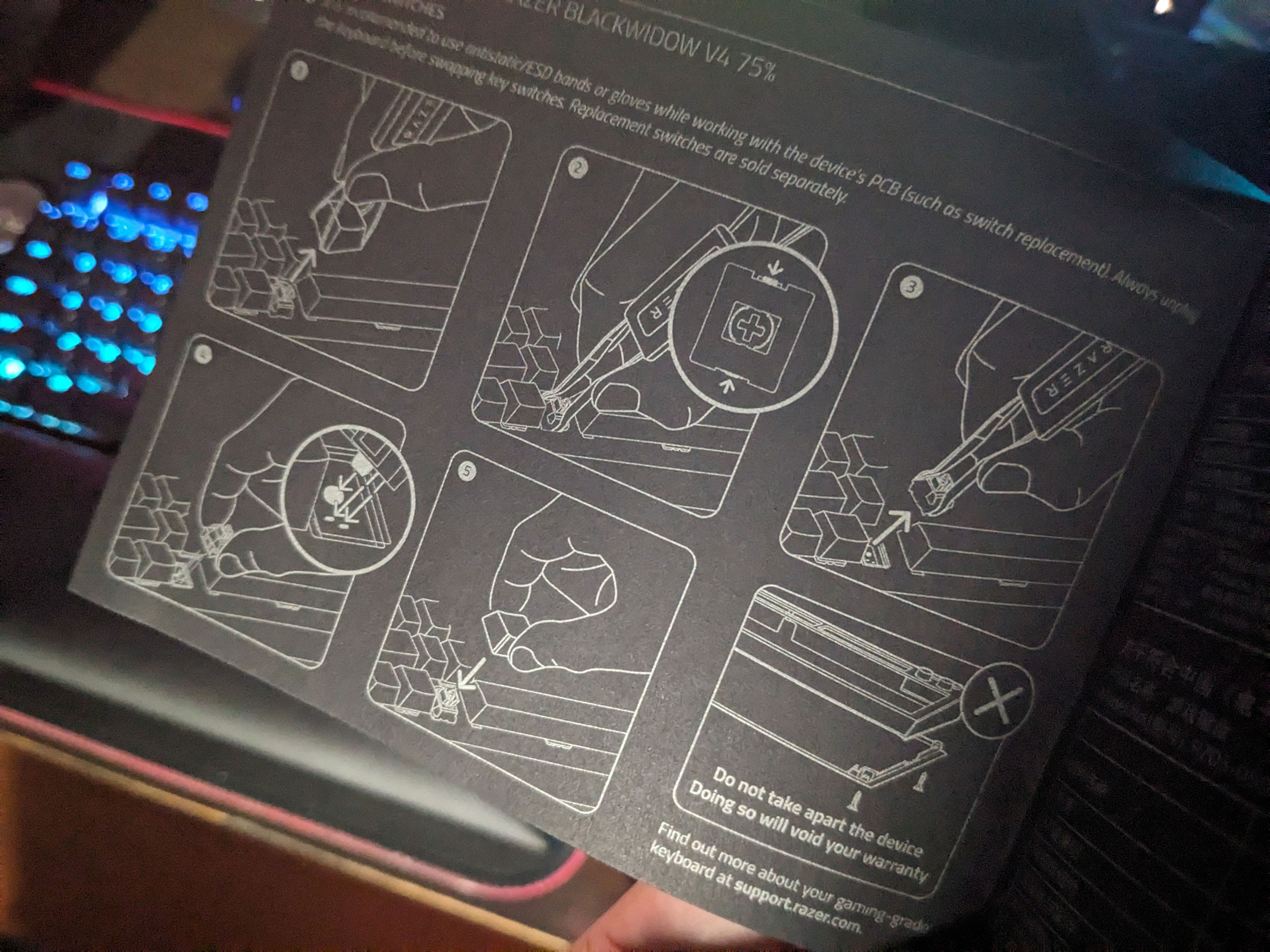 В инструкции к Razer Blackwidow V4 75% четко сказано, что разборка клавиатуры снимает ее с гарантии. Это обеспечивается пломбой на винте у USB-разъема.