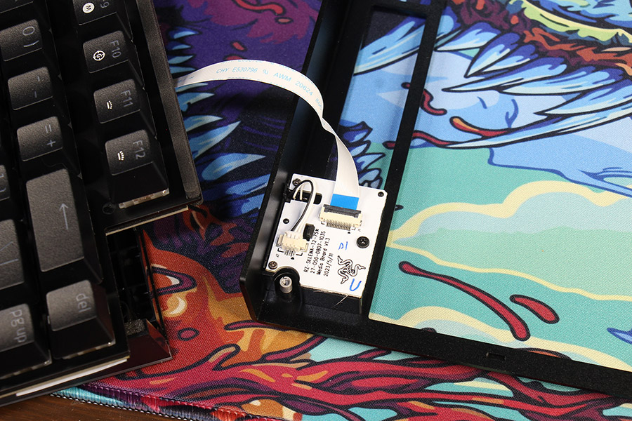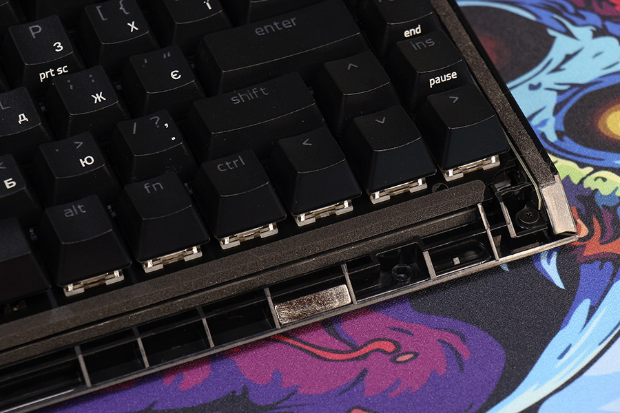 Все это крепится к корпусу не жестко, а с помощью пороновых прокладок. Такая схема называется gasket-mount и является конструктивно самым важным достижением Razer Blackwidow V4 75% после возможности замены переключателей. Благодаря прокладкам, вибрации от ударов по клавишам не передаются на корпус, а вся плата еще и получает определенную возможность движения. Первое улучшает звучание, второе смягчает ощущение при наборе текста.