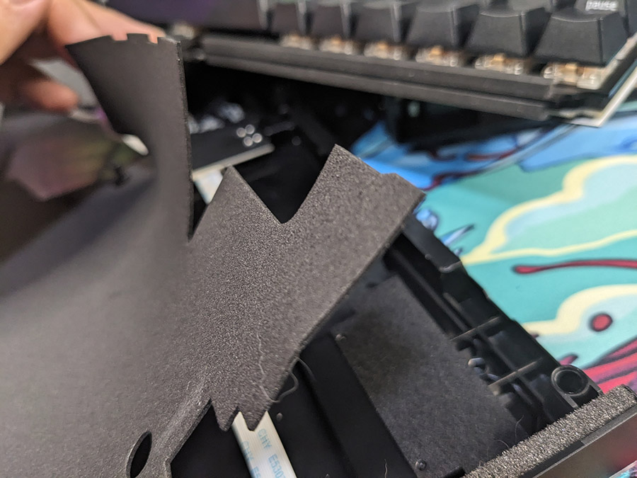 Наконец, между платой и корпусом находится слой шумоизоляции. В отличие от всего прочего, он что-то не очень впечатляет — пена толщиной 1 мм — это просто лучше, чем ничего. Впрочем, если уж терять гарантию, чтобы сюда добраться, то заменить на более толстую будет несложно. Гораздо проще, чем если бы, скажем, у этой клавиатуры не было шумоизоляции между плейтом и PCB.