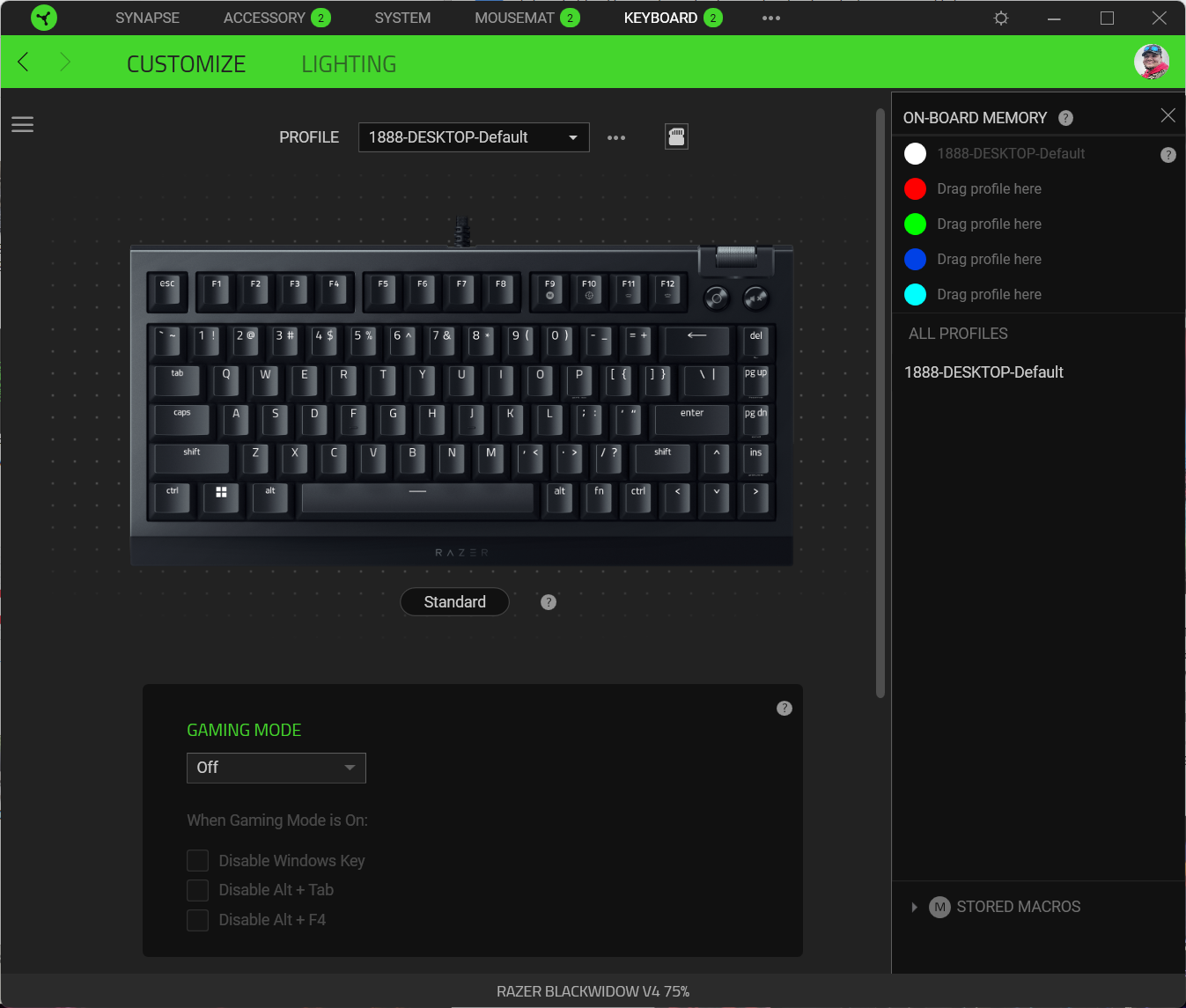 Вдобавок, клавиатура имеет встроенную память на пять профилей и для сохранения макросов. Все настройки в дальнейшем работают без предварительной установки Razer Synapse.