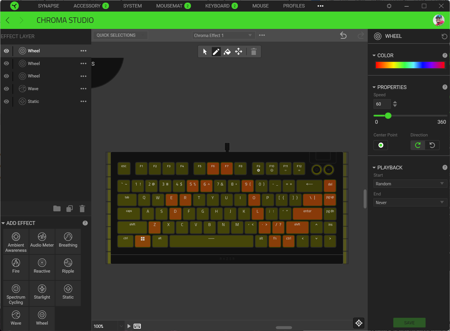 Гораздо более широкие возможности для настройки подсветки предоставляет отдельное приложение Razer Chroma Studio. Оно буквально позволяет контролировать каждый светодиод в отдельности и разрабатывать сложные комбинации эффектов для Blackwidow V4 75% и всех других совместимых устройств, не только производства Razer. Среди заводских программ контроля подсветки Chroma Studio занимает недостижимое первое место.