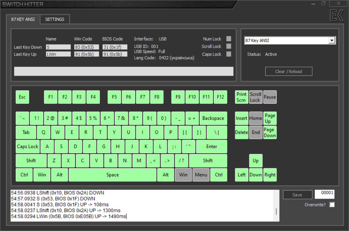 Естественно, клавиатура поддерживает NKRO. Скриншот Switch Hitter напоминает о том, каких клавиш не хватает по сравнению с типичным tenkeyless-форматом:
