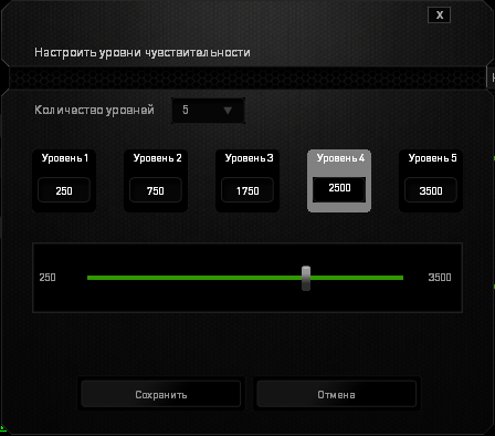 Можно настроить пять отдельных уровней чувствительности, которые будут переключаться «на лету». Жаль лишь, что отдельной механической кнопки для их переключения на мыши не предусмотрено.