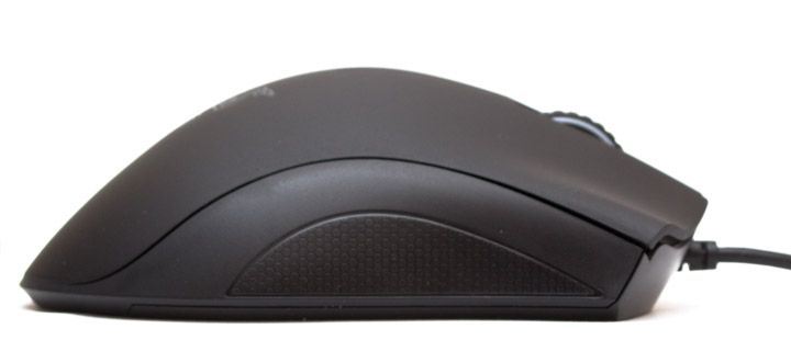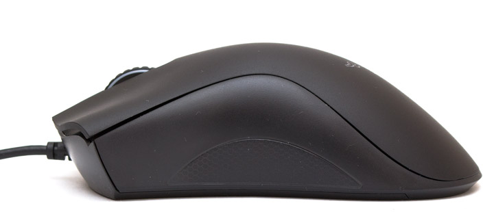Левая боковина выполнена из более гладкой пластмассы. Дополнительные кнопки на ней отсутствуют и это первое заметное отличие от всех остальных вариаций на тему DeathAdder. В нижней части есть текстурная цепкая вставка, чья пластмассовая поверхность сделана в виде мелких шестиугольников. Справедливости ради стоит отметить, что большой палец руки держится за эту поверхность как влитой, независимо от того — влажная рука или сухая.