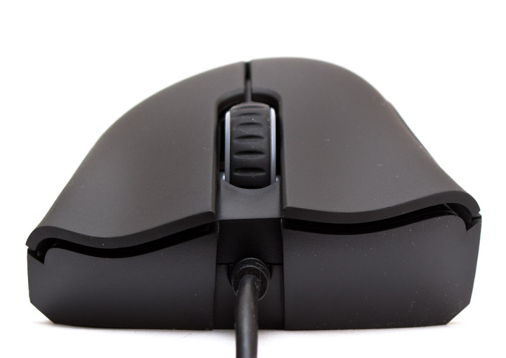 Спереди все выглядит вполне привычно. Шнур входит в мышь ровно по центру, на приличной высоте. Защита от перегиба присутствует. Колесо прокрутки прорезиненное, с небольшими выемками. Позиции фиксации у него мягкие, но тактильно различимые. Колесико практически не болтается и прокручивается относительно тихо, с приглушенным потрескиванием, если вращать его быстро и по направлению «от себя». Все три клавиши нажимаются со средним усилием и негромким кликом. Запаса свободного хода у них не ощущается, тактильный отклик о срабатывании после нажатия — отчетливый.