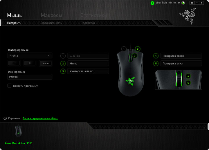 Базовый экран настройки мыши позволяет переназначить команды на трех кнопках и двух направлениях колеса прокрутки. На выбор есть стандартные команды мыши или клавиатуры, функции Windows приложений и макросы. Все настройки можно сохранить в индивидуальные профили, активация которых привязывается по необходимости к запуску тех или иных программ.