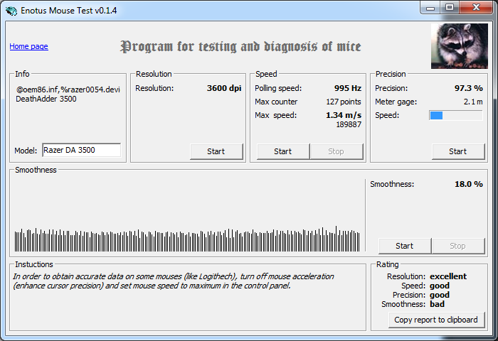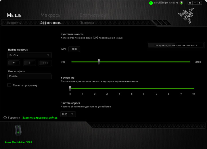 В настройках «эффективности» регулируется разрешение сенсора в пределах от 250 до 3500 dpi с шагом в 250 dpi. Оси X и Y при этом задаются исключительно синхронно. Позитивная акселерация курсора выставляется в рамках от 0 до 10 единиц. На выбор есть три частоты опроса — 125, 500 или 1000 Гц.