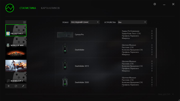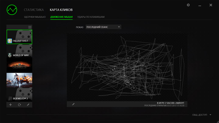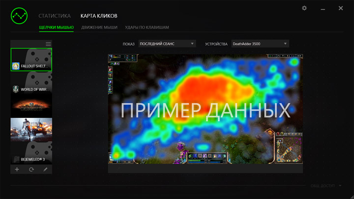 Модуль статистики при активации собирает количественные данные про использование мыши. Данные аккумулируются раздельно по всем используемым игровым приложениям и устройствам.