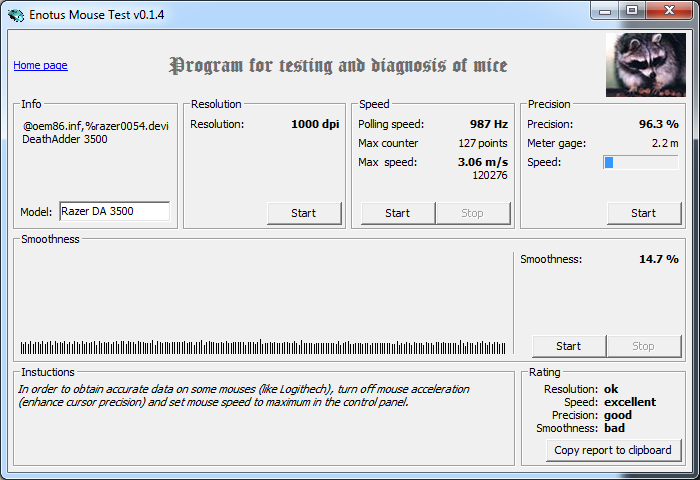 Тестирование мыши Razer DeathAdder 3500 производилось на коврике Razer Goliathus WoT (Speed medium). Это одна из тех мышей, которая обладает идеальной эргономикой, и я не вижу особого смысла расхваливать ее лишний раз. Поверхность сделана из шероховатого материала, который устойчив к накоплению отпечатков и грязи, быстро испаряет жидкость, благодаря чему рука не запотевает. Пластиковые шестиугольные накладки по бокам обеспечивают отличное сцепление корпуса с пальцами. Мышь легкая по весу и отлично сбалансирована по осям. Три основные кнопки нажимаются со средним усилием и четкой тактильной отдачей. Колесо прокрутки вращается мягко и относительно тихо. Потрескивание в нем слышно лишь при быстрой прокрутке вперед. Ножки скользят плавно, с небольшой инерцией. Подсветка колеса и логотипов выглядит хорошо, программное обеспечение просто и понятное.